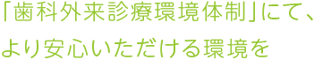 歯科外来診療環境体制とは、歯科診療時の偶発症など緊急時の対応及び感染症対策として装置・器具の設置や病院との提携等の取り組みを行っている体制です。当院でもAED設置をはじめ、加古川中央市民病院とも提携することで、より患者さまが安心して通っていただる環境づくりに取り組んでおります。